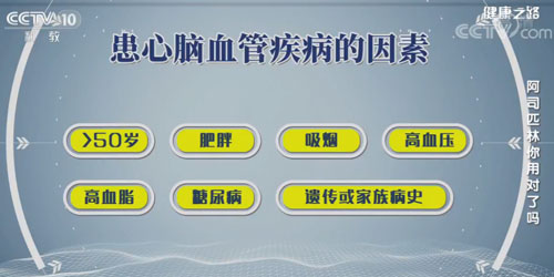 患心腦血管疾病的因素有大于50歲、肥胖、吸煙、高血壓、高血脂、糖尿病、遺傳和家族病史。