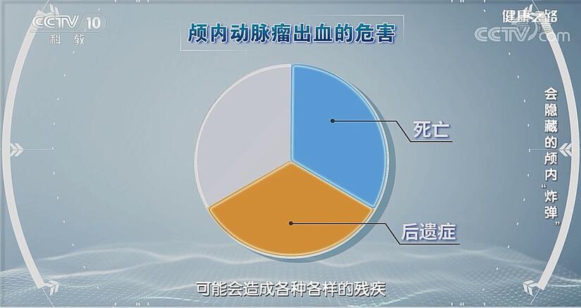 顱內動脈瘤早期會造成大量出血,造成顱內壓急速增高,患者出現昏迷、死亡或者嚴重殘疾;腦出血吸收期出血還會造成組織崩解,損害腦血管造成腦血管痙攣。一些患者還可能出現二次出血,二次出血一旦發生,死亡率高達70%。