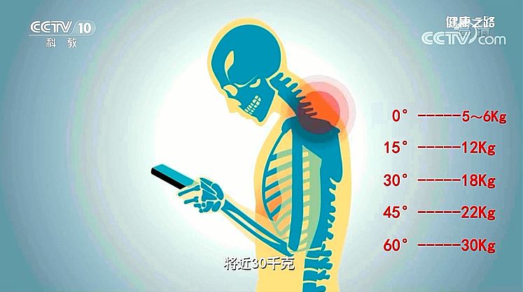 當人處于直立狀態(tài)時,頸后部的肌肉、關(guān)節(jié)、韌帶承受的力量約5~6千克;低頭15度時,承受的力量約12千克;低頭30度時,承受的力量約18千克;低頭45度時,承受的力量約22千克;低頭60度時,承受的力量約30千克!