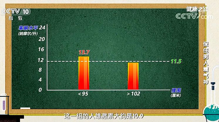 腰圍、肥胖度和雄激素的減少有著直接關(guān)系,一組源于歐洲的數(shù)據(jù)顯示,正常雄激素標準為11.5,腰圍低于95厘米的人雄激素最高,平均約為13.7;而腰圍大于102厘米時,雄激素大約是10.9,低于正常值。