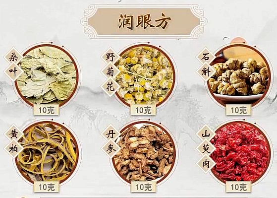 潤眼方由六味藥組成,分別是桑葉10克、野菊花10克、石斛10克、黃柏10克、丹參10克、山萸肉10克。
