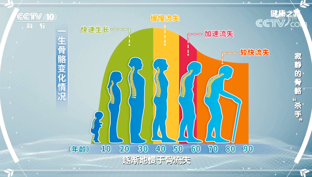 人體骨骼隨著年齡的增長不斷變化,30歲之前,成骨活性大于骨流失量,骨骼逐漸變得強壯;30-40歲之后,成骨的活性、功能逐漸慢于骨流失;60-70歲之后,老年人骨量流失越來越快,容易發(fā)生骨質(zhì)疏松。