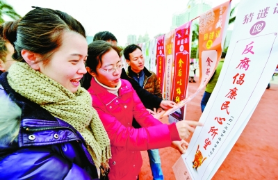 福州市民們在競猜以廉潔為主要內容的謎語。 新華社發