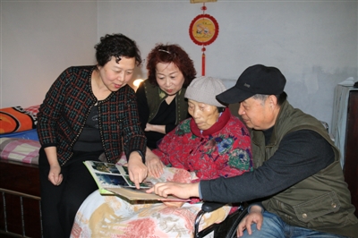 大兒子、三女兒和幺女陪老人一起看以前的照片