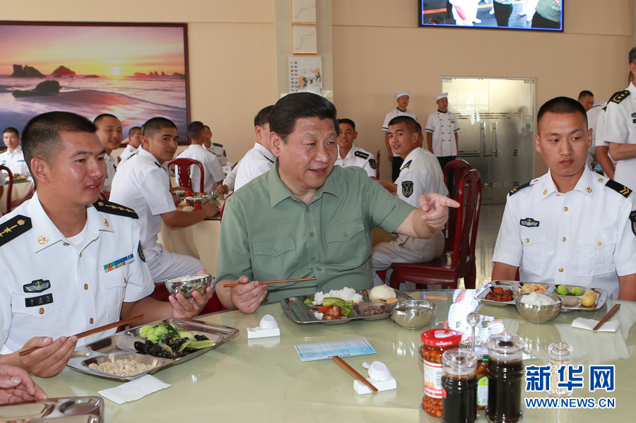 在水兵餐廳,習近平同廣大官兵一起吃飯,說工作,嘮家常。兩份菜、一份飯、一碗粥,這一餐,樸實又簡單。