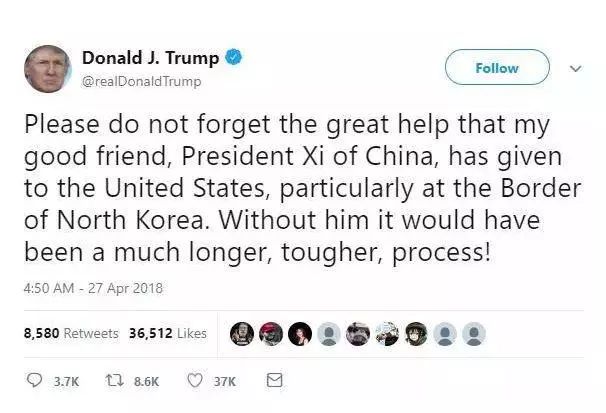之前,在4月27日朝韓領導人成功舉行會晤之后,特朗普還曾發推特專門感謝習近平主席:請不要忘記我的好朋友習近平主席給予美國的、特別是在朝鮮邊境上的巨大幫助。沒有他的幫助,這本會是一個更加漫長和艱難的過程。