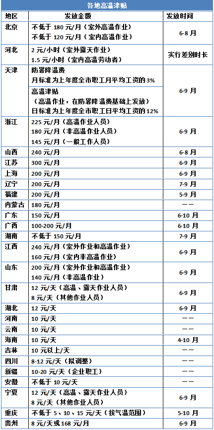 從高溫津貼發(fā)放時(shí)間來看,各地也因氣候條件差異有所區(qū)別。如,北京、山西等北方地區(qū)的發(fā)放時(shí)間段為6到8月,海南省的發(fā)放時(shí)間長達(dá)7個(gè)月,為4到10月。