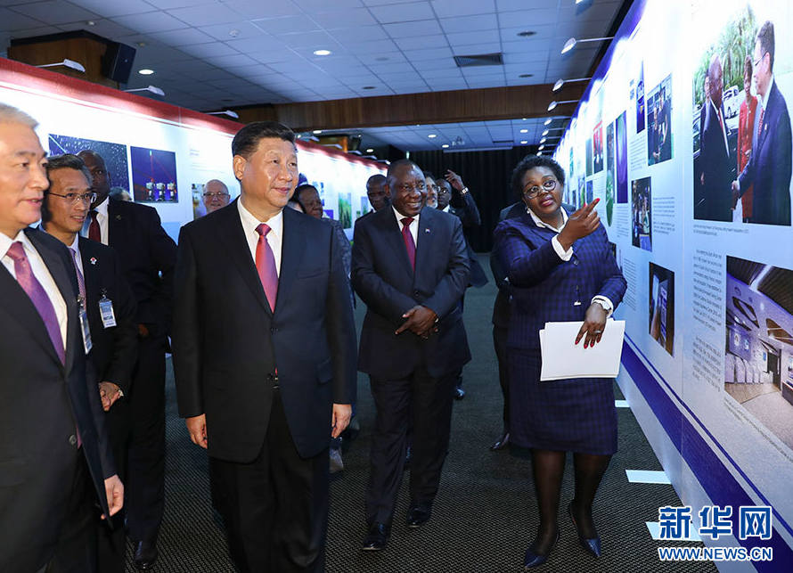 2018年7月24日,習近平和拉馬福薩共同參觀中南科技創新合作成果圖片展。(圖片來自:新華網)