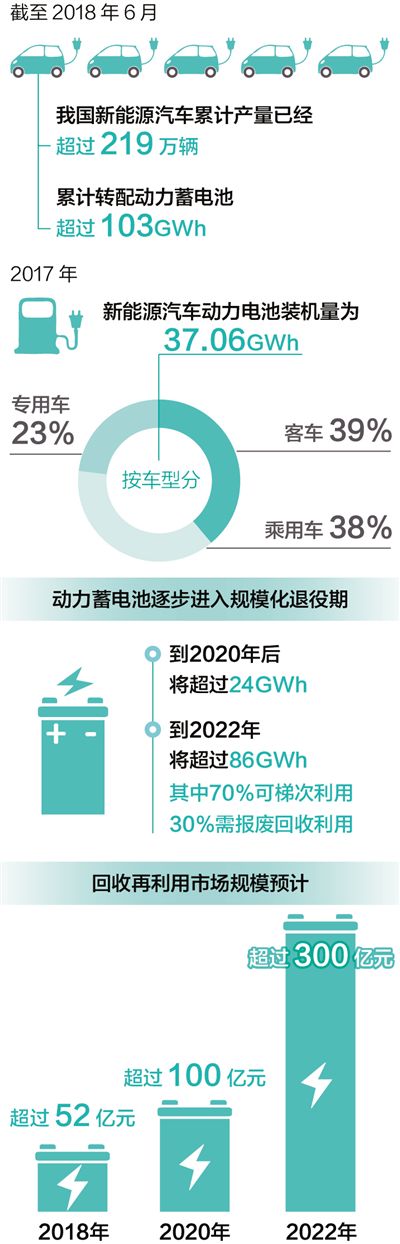 據(jù)預(yù)測(cè),新能源汽車動(dòng)力蓄電池回收再利用市場(chǎng)規(guī)模巨大:預(yù)計(jì)市場(chǎng)規(guī)模在2018年超過52億元,2020年將超過100億元,2022年將超過300億元。也就是說,動(dòng)力蓄電池回收再利用不僅是環(huán)保所需,還有著不小的經(jīng)濟(jì)效益。