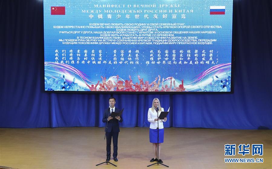 2018年9月12日,汶川地震后曾在兒童中心療養的北川男孩席浚斐(左)和中心輔導員娜塔莉亞共同宣讀《中俄青少年世代友好宣言》。 新華社記者謝環馳攝
