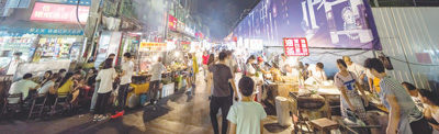 湖北武漢吉慶街一到晚上就展現出獨特的魅力,賣花的、賣唱的、吃飯的、閑逛的,人聲鼎沸。熱干面、豆皮、面窩、鴨脖子、蝦球、毛豆……讓人們深夜依舊流連忘返。