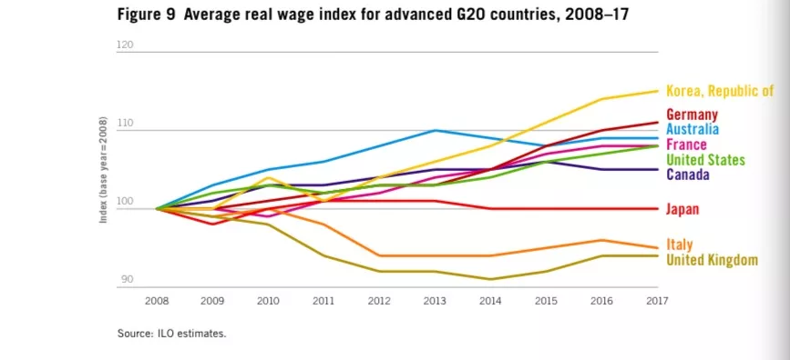 其中,在G20發(fā)達(dá)國(guó)家中,英國(guó)工人的實(shí)際工資增幅最弱。2008年至2017年間,英國(guó)實(shí)際工資增長(zhǎng)(剔除通脹影響)下降了約5%,遠(yuǎn)遠(yuǎn)落后于美國(guó)和德國(guó)等G20其他主要國(guó)家。