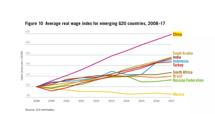 國(guó)際勞工組織表示:“在2006-2017年期間,亞洲和太平洋地區(qū)工人的實(shí)際工資增長(zhǎng)在所有地區(qū)中是最高的。這反映了亞洲和太平洋地區(qū)比其他地區(qū)更快的經(jīng)濟(jì)增長(zhǎng),中國(guó)、印度、泰國(guó)和越南等國(guó)位居榜首。”