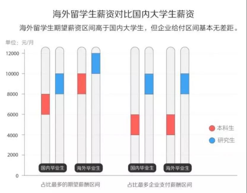 這一點也反映在了留學生的實際待遇上面。從海外留學生的期望薪資上看,由于海外留學生在學習費用、生活費用上的支出更大,因此期望薪資范圍高于國內大學生。不過,在企業支付薪酬上,海外留學生與國內大學生沒有差異。