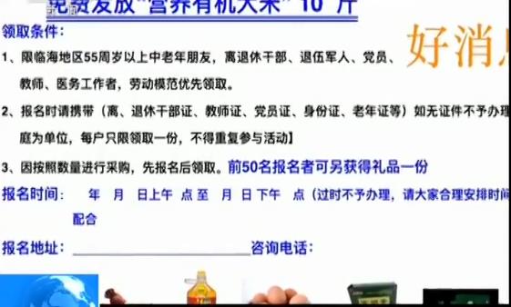 在收繳的電子證據(jù)中,記者看到了一份“抗擊血栓 讓愛無限 免費發(fā)放有機大米”的宣傳單。記者注意到,這份宣傳單上寫著發(fā)放對象限55歲以上中老年消費者。
