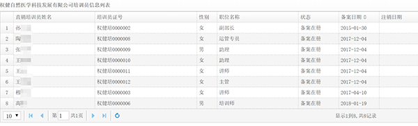 澎湃新聞記者在商務部官網上查詢到,獲得直銷牌照的權健自然醫學科技發展有限公司下設10個直銷分支機構; 23個直銷服務網點;擁有直銷培訓員在冊8人,注銷7人。