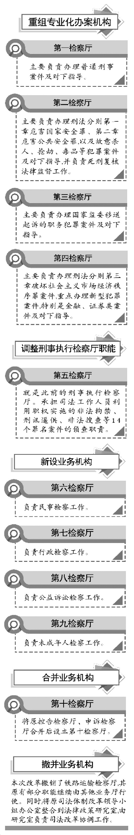 12月17日,最高檢召開機關內設機構改革動員部署大會,將原偵查監(jiān)督廳、公訴廳、公訴二廳、刑事執(zhí)行檢察廳、民事行政檢察廳、控告檢察廳、申訴檢察廳、鐵路運輸檢察廳、未成年人檢察工作辦公室、司法體制改革領導小組辦公室、監(jiān)察局、巡視工作領導小組辦公室等部門整合、優(yōu)化,重新組建為第一至第十檢察廳。