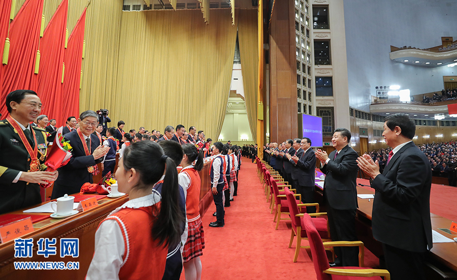 2018年12月18日,慶祝改革開放40周年大會在北京人民大會堂隆重舉行。中共中央總書記、國家主席、中央軍委主席習近平在大會上發表重要講話。這是習近平等鼓掌向受表彰人員表示祝賀。 新華社記者 鞠鵬 攝