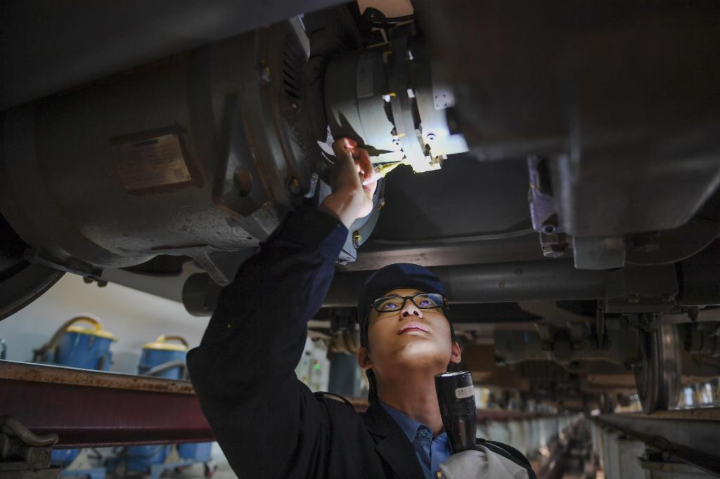 1月20日,在位于福州城北的動(dòng)車檢修車間,李長(zhǎng)安在檢修車輛。