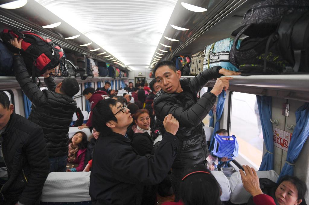 1月21日,李長(zhǎng)安被抽調(diào)到加開(kāi)的K4186次列車上,引導(dǎo)旅客正確放置行李。