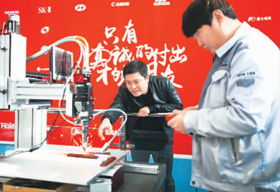 1月10日,在山東淄博,創(chuàng)業(yè)者顏景川(左)和同事調(diào)試激光焊接機(jī)。新華社記者 潘思危攝