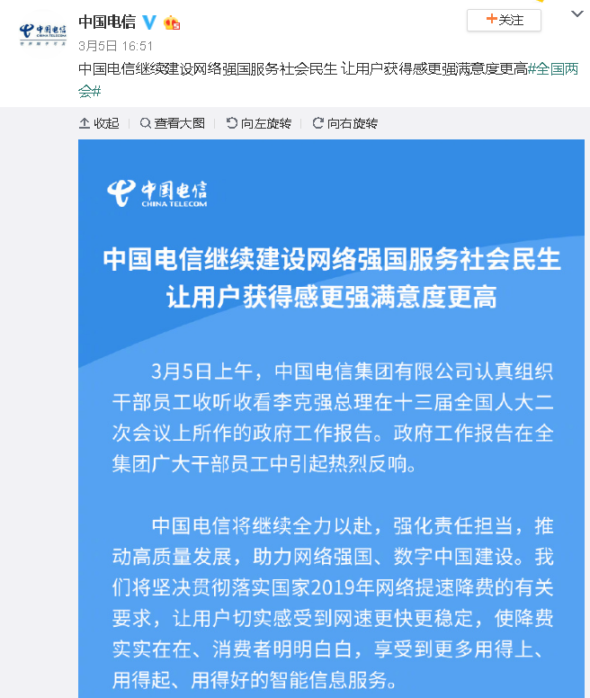 中國電信表示,堅決貫徹落實國家2019年網絡提速降費的有關要求,讓用戶切實感受到網速更快更穩定,使降費實實在在、消費者明明白白,享受到更多用得上、用得起、用得好的智能信息服務。
