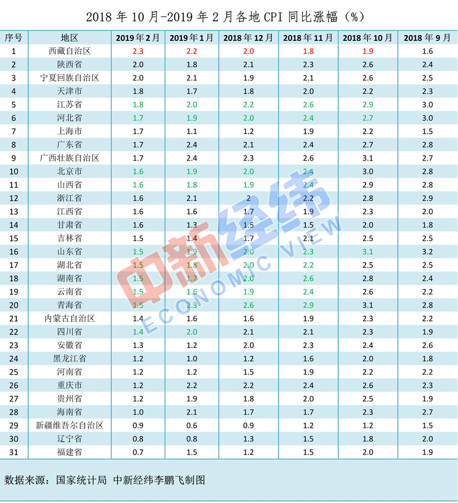 其中,西藏2月份CPI同比漲幅領漲全國,已連續3個月漲幅超過2%。2月份CPI同比漲幅最低的是福建省,僅為0.7%,較1月大幅回落0.8個百分點。此外,新疆連續6個月位列漲幅最低的前三名。
