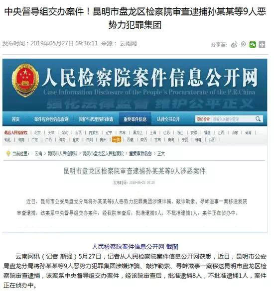 5月27日,記者從人民檢察院案件信息公開網(wǎng)獲悉,近日,昆明市公安局盤龍分局將孫某某等9人惡勢(shì)力犯罪集團(tuán)涉嫌詐騙、敲詐勒索、尋釁滋事一案移送昆明市盤龍區(qū)檢察院審查逮捕,該案系中央督導(dǎo)組交辦案件,經(jīng)該院審查后,批準(zhǔn)逮捕8人,不批準(zhǔn)逮捕1人,案件正在偵辦中。