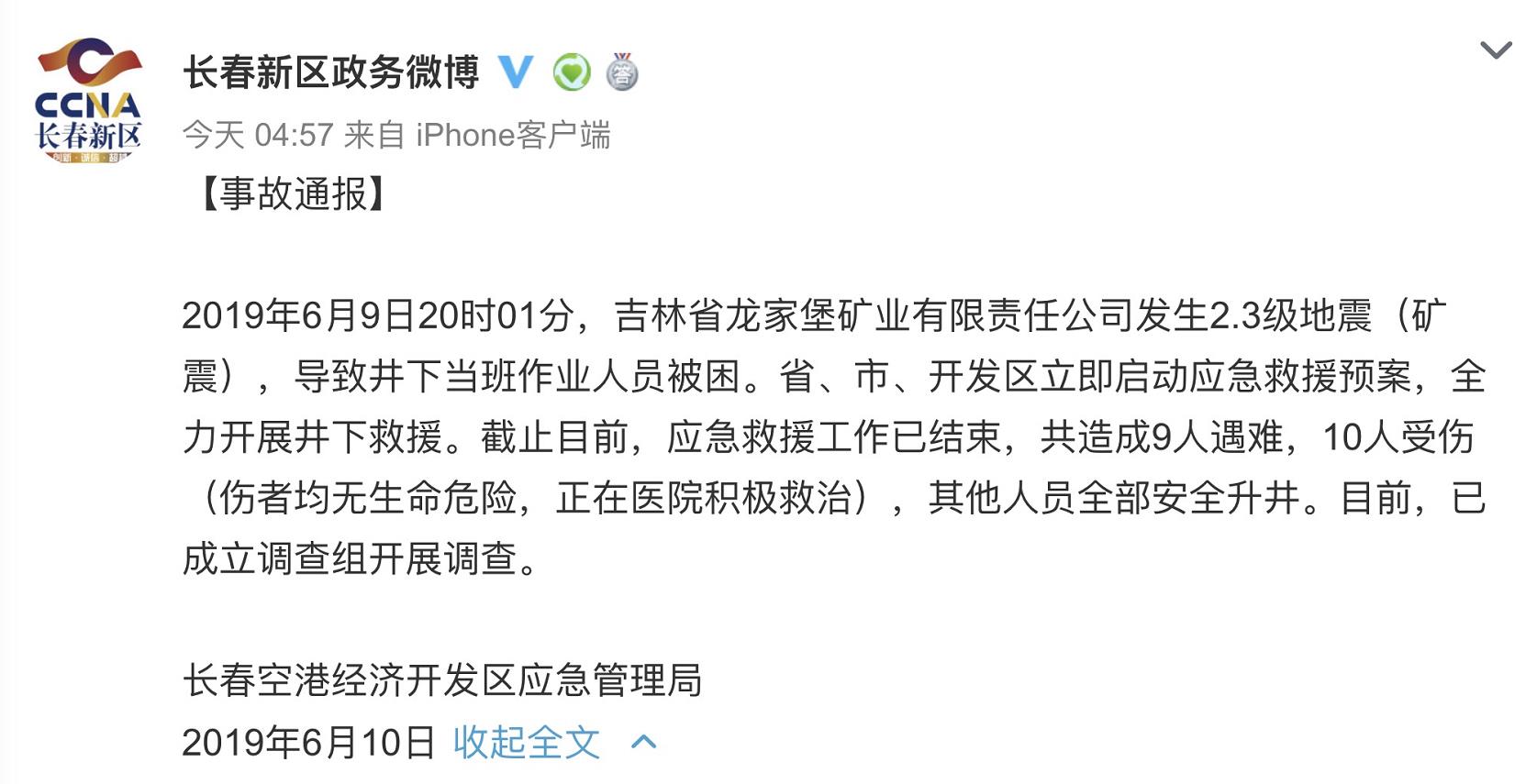 據長春空港經濟開發區應急管理局發布,6月9日20時01分,吉林省龍家堡礦業有限責任公司發生因采礦誘發2.3級地震,導致井下當班作業人員被困。截止目前,應急救援工作已結束,共造成9人遇難,10人受傷。傷者均無生命危險,正在醫院積極救治,其他人員全部安全升井。目前,當地已成立調查組開展調查。(央視記者 孫建德)?