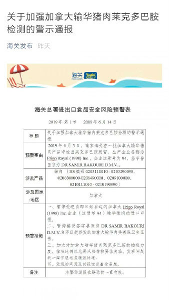 據路透社6月18日報道,海關總署在其微信公眾賬號中稱,這家企業是Frigo Royal。一些國家使用萊克多巴胺用作飼料添加物以促進豬的肌肉生長,但中國禁止使用該成分,也不允許進口豬肉有該物質殘留。
