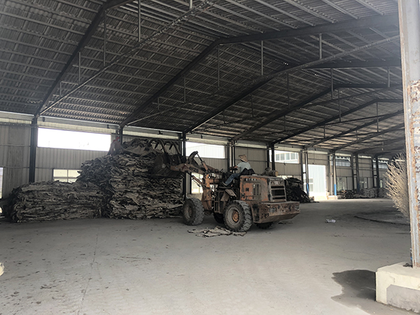 華誠公司倉庫內,工人正在用鏟車搬運驢皮。