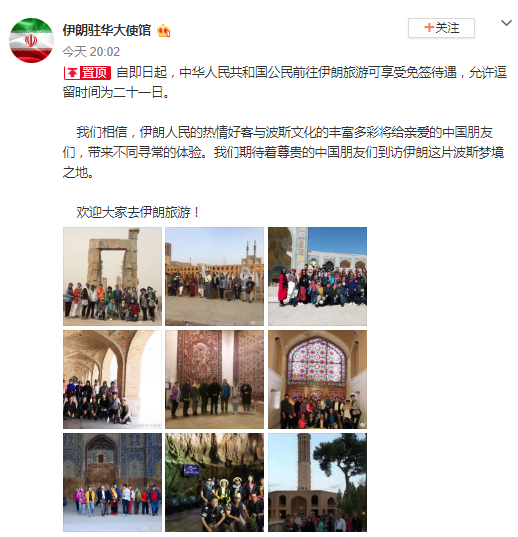 伊朗駐華使館:伊朗對中國公民免簽 允許逗留21天