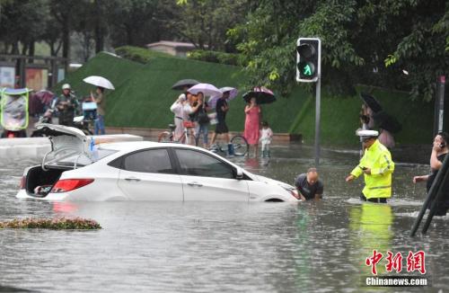 7月22日,四川成都,民警對(duì)水中滯留的車(chē)輛進(jìn)行救援。 安源 攝