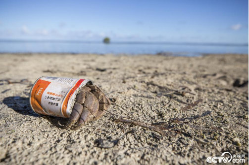 ●位于中太平洋的密克羅尼西亞的偏遠島嶼佩里琉,一只寄居蟹利用廢棄的錫罐作為它的“家”。