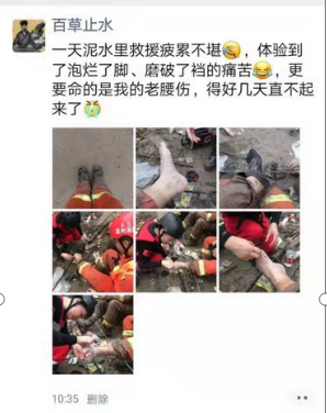 臺風帶來的暴雨引發山洪,消防隊員們長時間在水中站立,腳上的水泡幾乎是所有人的“軍功章”。