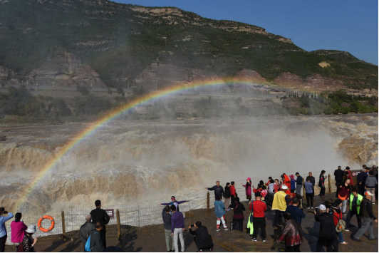 ●22日,眾多游客在山西臨汾吉縣黃河壺口瀑布景區欣賞“彩虹橋”美景。