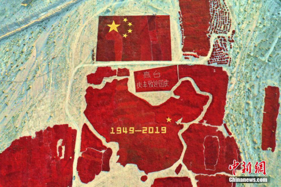 ●甘肅張掖戈壁灘上,當地農民用辣椒和玉米拼起3萬多平方米的巨型中國地圖和國旗,以此方式慶祝豐收,喜迎國慶。