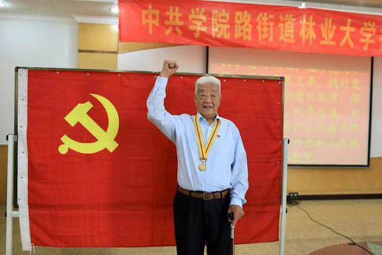 ●支部里年齡最大的新黨員!?9月21日,在北京市海淀區學院路街道黨工委和北京林業大學社區黨總支的見證下,102歲抗戰老兵張守中宣誓入黨。