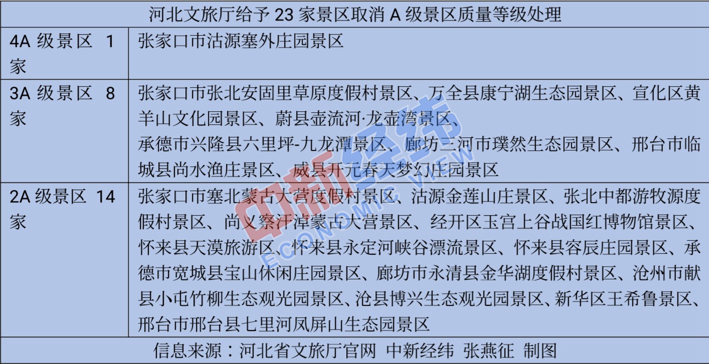根據檢查情況,河北文旅廳給予23家景區取消A級景區質量等級處理,包括1家4A級景區、8家3A級景區、14家2A級景區。此外,還對84家A級景區進行通報批評。其中,承德市避暑山莊等18家4A級以上旅游景區,責令限期6個月整改;對石家莊市行唐縣神樹灣等66家3A級以下景區進行了通報批評。