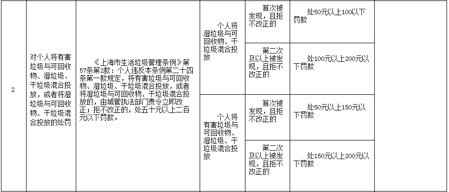 《上海市生活垃圾管理條例》行政處罰裁量基準顯示,個人將濕垃圾與可回收物、干垃圾混合投放,首次被發現,且拒不改正的處50元以上100以下罰款;第二次及以上被發現,且拒不改正的,處100元以上200元以下罰款。