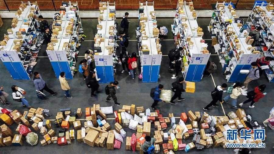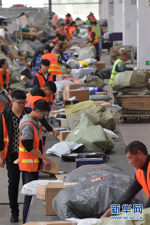在圓通速遞公司南昌轉運中心,工作人員正在流水線上分揀快遞包裹(2018年11月14日攝)。新華社記者 彭昭之 攝