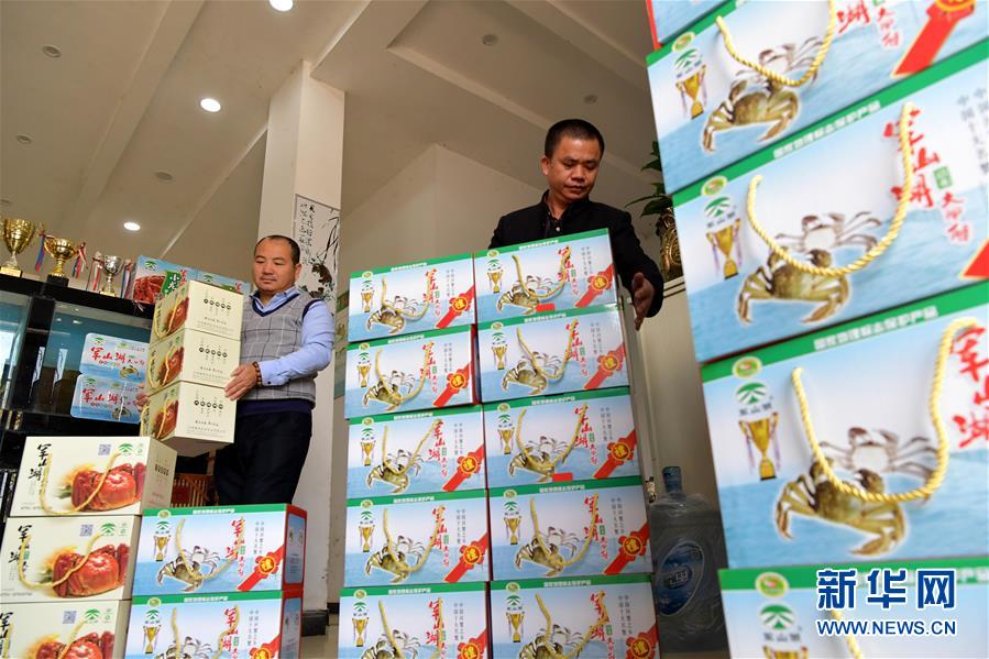 在江西省進賢縣軍山湖大閘蟹線上銷售網點,工作人員準備將裝箱的大閘蟹發貨給網購的顧客(2018年11月9日攝)。新華社記者 彭昭之 攝