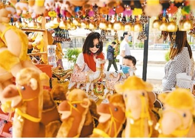 “五一”假期,甘肅省敦煌市在做好疫情防控的前提下,有序開放部分旅游場(chǎng)所。圖為在敦煌市鳴沙山月牙泉景區(qū)門口,游客們正在挑選當(dāng)?shù)靥厣∩唐罚瑲g度假日。侯崇慧攝(人民視覺)