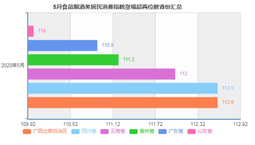 具體省份來看,廣西、四川、云南、貴州、廣州、山東等6省份食品煙酒類居民消費指數同比漲幅均超兩位數,分別為12.6%、12.6%、12%、11.2%、10.9%、10%,值得注意是,上述6省份5月份CPI同比漲幅均超全國。