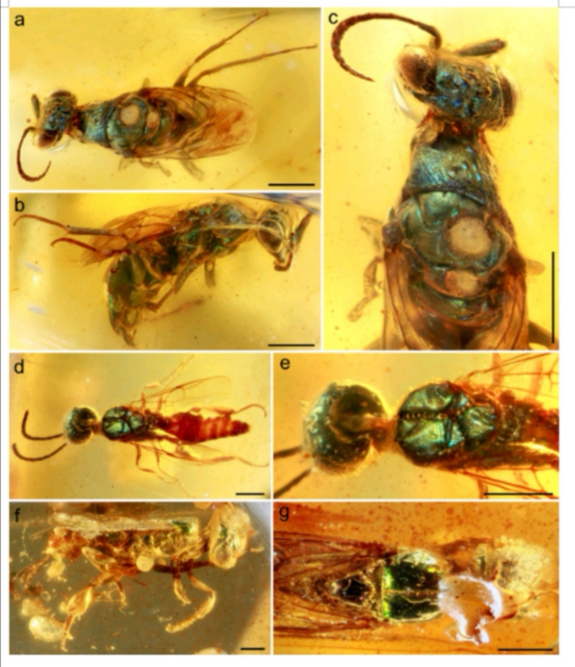 科研團隊從白堊紀中期標本中(距今約1億年)篩選出35枚保存精美的帶金屬光澤的昆蟲化石,共包括3個目(膜翅目、鞘翅目和雙翅目),至少7個科;其中絕大部分標本屬于膜翅目青蜂科,少部分屬于鞘翅目隱翅蟲科、蠟斑甲科和隱翅蟲科,以及雙翅目的水虻科。大部分中昆蟲種類的全身或是部分身體結構呈現出強烈的具金屬光澤的綠色、藍色、藍綠色、黃綠色或藍紫色。通過與古生、現生物種的對比研究,發現這些化石昆蟲對應的現生屬種同樣有類似的帶有金屬光澤的顏色。因此這一發現直接證明了中生代昆蟲的亮眼結構色是可以保存下來的。并且通過對其中一枚化石青蜂標本的超微分析,證實了多層反射膜是產生結構色的直接原因,這也代表著自然界中最為普遍的一類形式的結構色。