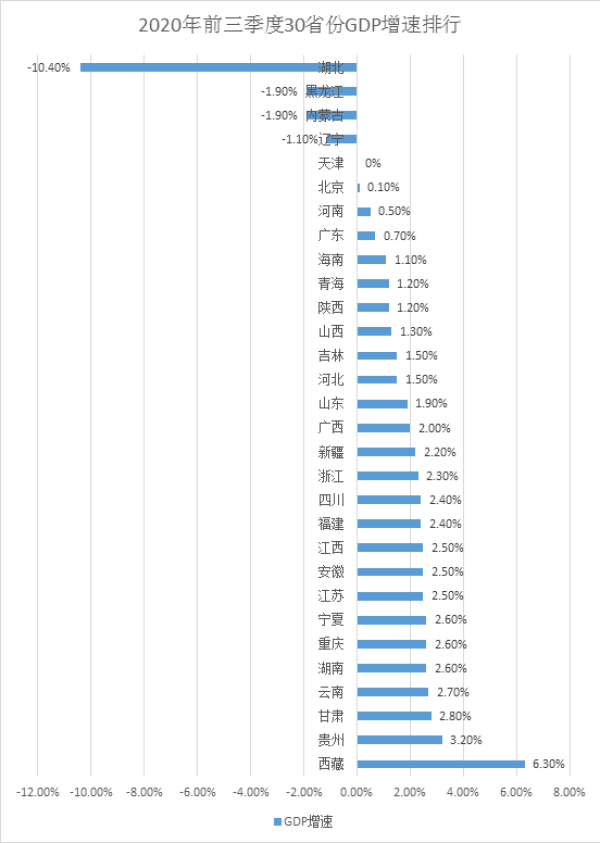 從前三季度經(jīng)濟增速上看,30省份中,25省份已實現(xiàn)正增長,其中23省份超越或持平于全國線(0.7%)。遼寧、內(nèi)蒙古、黑龍江、湖北負增長,天津增速為0%。