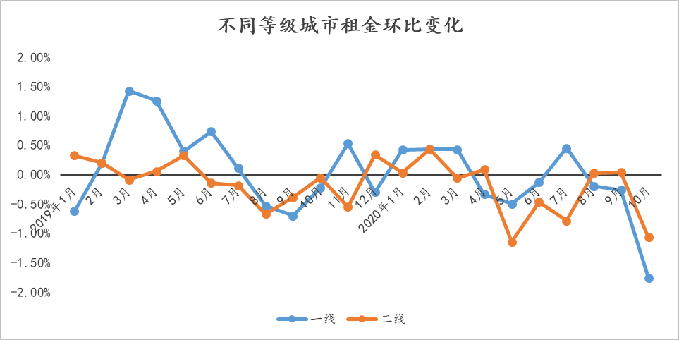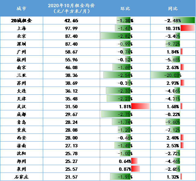 表:全國大中城市2020年10月份租金均價及同環(huán)比變化幅度