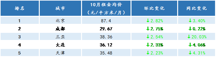 從環(huán)比跌幅TOP5城市來看,10月份租金跌幅前5城市分別是北京、成都、三亞、大連、天津。北京受到疫情反復的影響,加上現(xiàn)階段進入行業(yè)淡季,市場活躍度呈現(xiàn)持續(xù)下降趨勢。三亞隨著邁入旅游淡季,租賃需求減弱,租金水平明顯下滑。