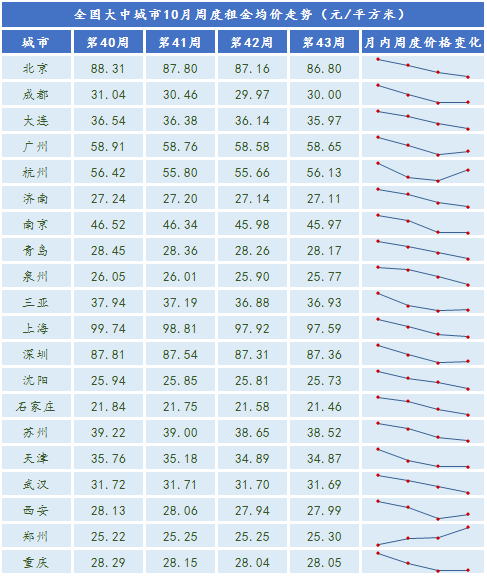 報告稱,10月,全國大中城市租金掛牌均價為42.65元/平方米/月,環(huán)比下降1.3%,同比下降2.48%,環(huán)比降幅較上月擴大1.25個百分點。各等級城市租金水平均呈現(xiàn)下滑態(tài)勢,行業(yè)淡季之下市場活躍度顯著下降。