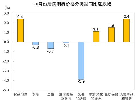 10月份,全國居民消費價格環比下降0.3%。其中,城市下降0.3%,農村下降0.5%;食品價格下降1.8%,非食品價格上漲0.1%;消費品價格下降0.6%,服務價格上漲0.1%。